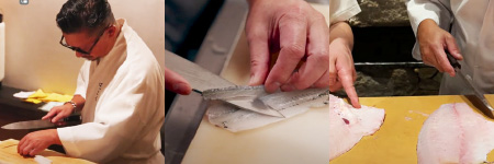 切った魚を好きな角度から魚を眺めることが出来るので、自分の目の前の魚とその映像の魚を同期させて、齋藤氏の包丁捌きに合わせ、ご自身の包丁を動かしながら魚を捌くとで一流料理人の技を体感することができます。
